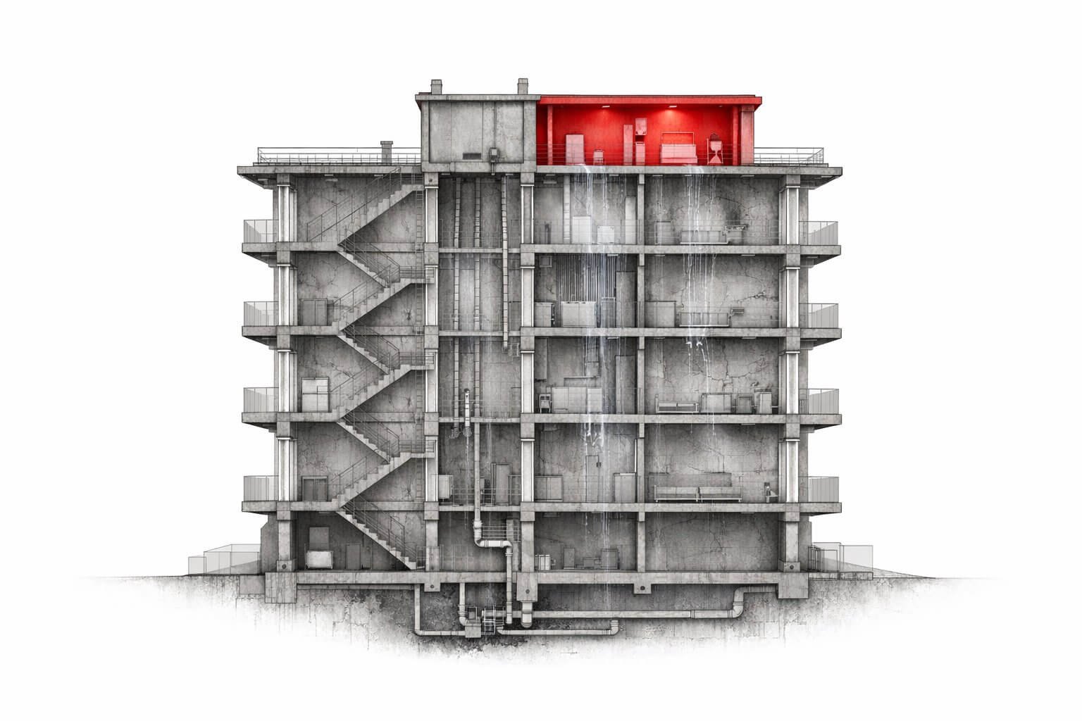 Un sistema constructivo —especialmente en inmuebles con años de uso, intervenciones sucesivas y mantenimiento irregular— opera como una red de variables interdependientes: pendientes, impermeabilización, estado de desagües, envejecimiento de materiales, modificaciones parciales, intervenciones históricas no documentadas y condiciones ambientales acumuladas.