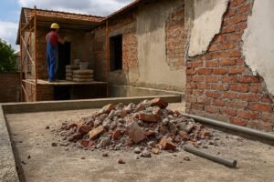 Muestran una hormigonera en marcha dentro de la unidad, albañiles trabajando, muros demolidos hasta el ladrillo, cañerías nuevas en instalación.